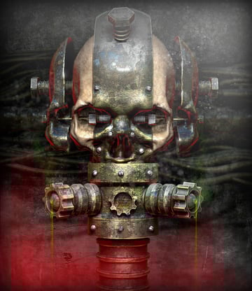 Crea un cráneo con textura metálica oxidado y gastado usando renders 3D