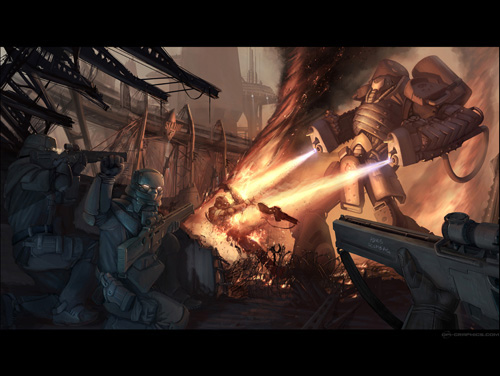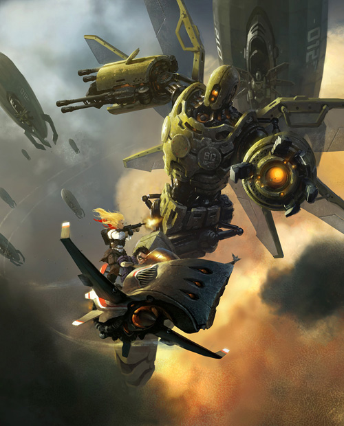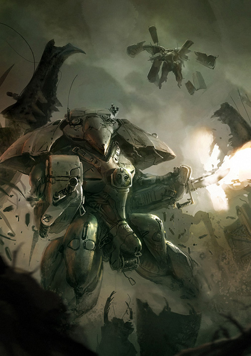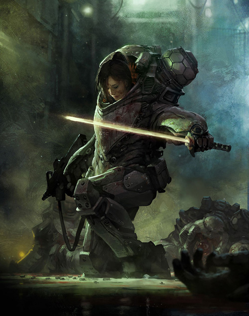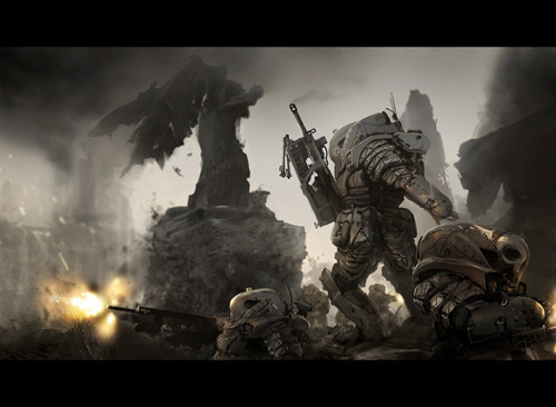 Esta pintura digital de Ukitakumuki fue completada como una pieza de "preconcepto" para Shrapnel (Zombie Studios).