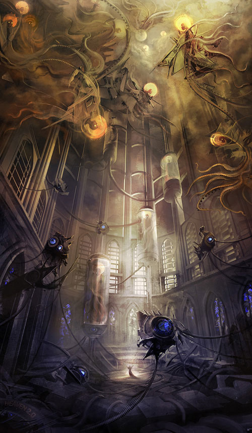 Esta gran obra de arte de Vitaly Alexius fue creada en Photoshop al monstruoso tamaño de 10.000 x 7.617 pixeles a 300 dpi. La ilustración (y la historia que la acompaña) fue presenciada en un sueño; se pasaron varias semanas en este proyecto.