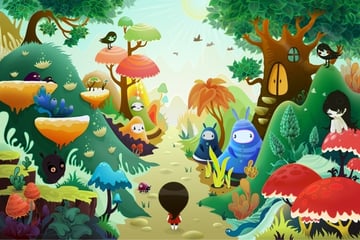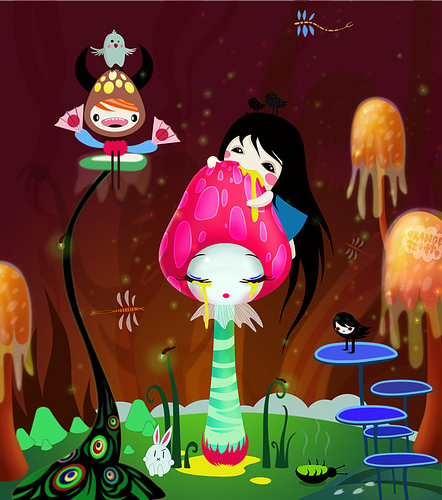 8. Tus ilustraciones son coloridas, llenas de divertidos personajes de fantasía; parecen estar contando una historia. ¿Es la historia lo primero que creas o las ilustraciones? ¿De dónde sacas las ideas y la inspiración para tus ilustraciones?