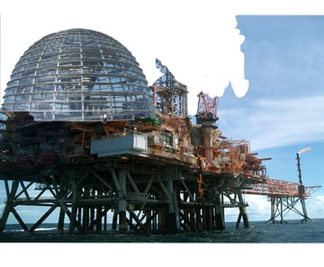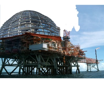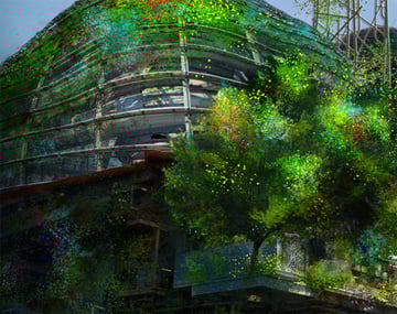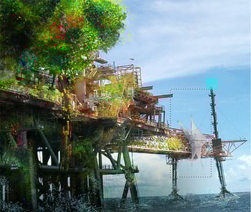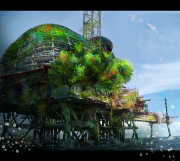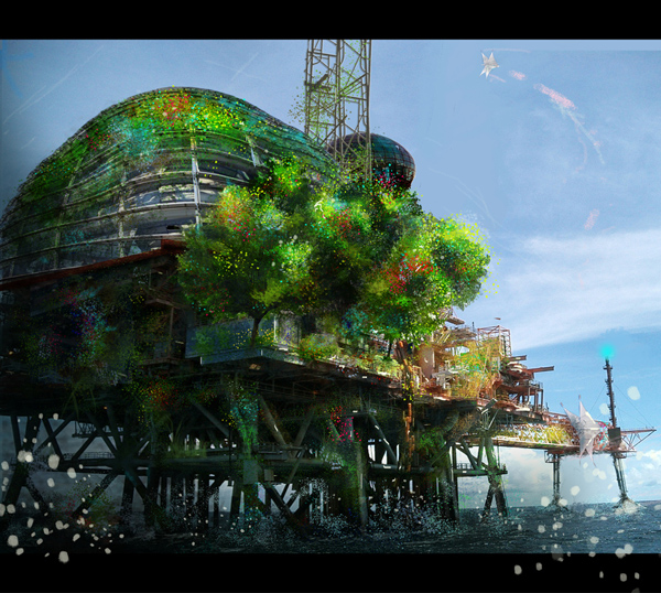 Ahora es tiempo de agregar más elementos sobre la imagen. Una cúpula de cristal está agregada para dar propósito a la imagen. No quieres una imagen en que las personas estén adivinando lo que están mirando. La cúpula suma a la credibilidad de que gente pudo vivir y trabajar en esa plataforma. Al hacer arte conceptual, la credibilidad es esencial.