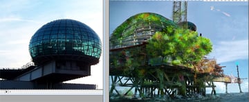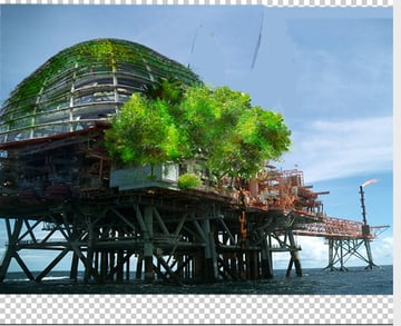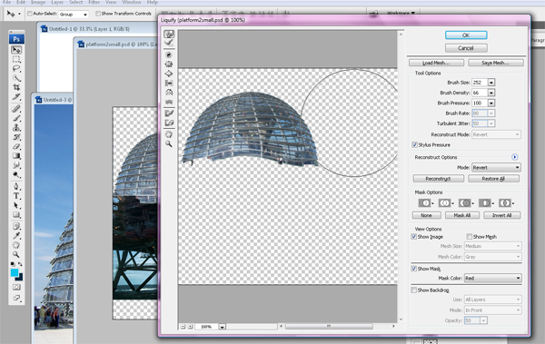 La perspectiva de la cúpula no exactamente coincide con la perspectiva de la imagen inicial. Para arreglarla, ve a Filtro > Licuar y deforma la imagen hasta que coincida. Asegúrate de utilizar un buen pincel desde que se edita toda la imagen y no por secciones. Deformando la cúpula le da a la plataforma un futurista y fantástico sentido dándole un inusual toque de curvas.