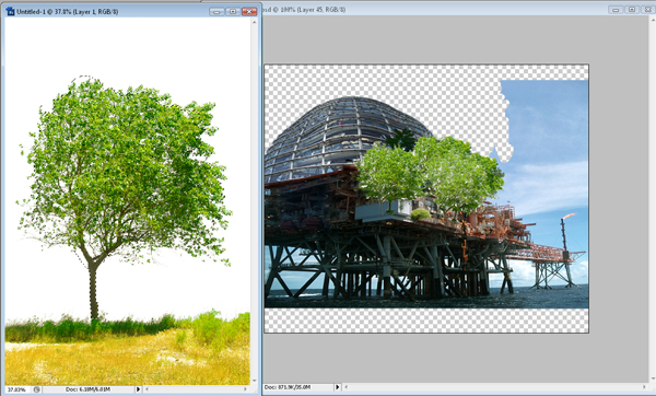 Lo siguiente, corta la imagen de un árbol y pégalo varias veces. Después de pegar el árbol, borra los bordes con un pincel moteado para disminuir la repetición.