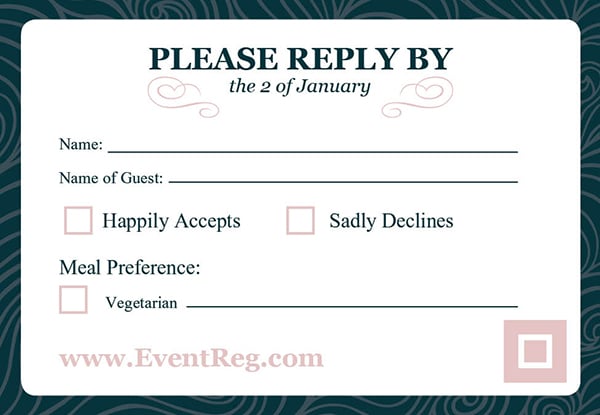 La mayor parte de la atención se concentra en la invitación, así que las tarjetas de respuesta pueden ser tan simples como un diseño en blanco y negro en cartulina blanca. Otras opciones pueden ser usar un color de texto sólido que coincida con su diseño en lugar de texto negro. De cualquier manera, los invitados van a escribir en esta tarjeta, por lo que el papel oscuro está fuera.