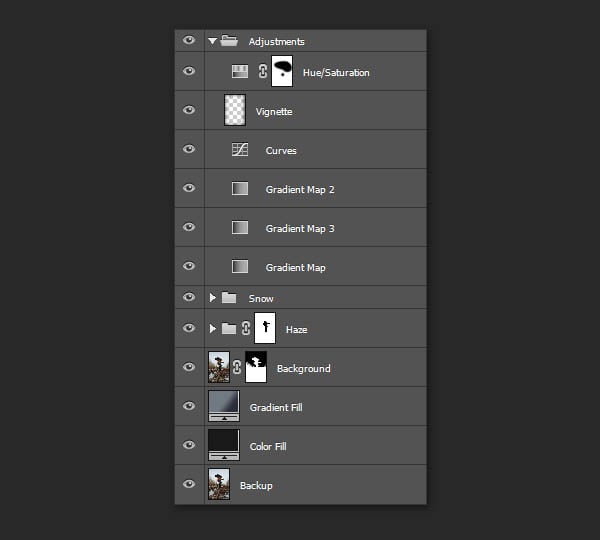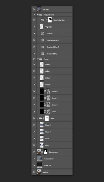 Назовите эти слои ‘Боке’. Поместите все эти слои внутри новой группы ‘Снег’. Примечание переводчика: выделите все слои со снегом и с эффектами Боке, а затем нажмите клавиши (Ctrl+G), чтобы сгруппировать все выделенные слои в одну группу. Назовите новую группу ‘Снег’.
