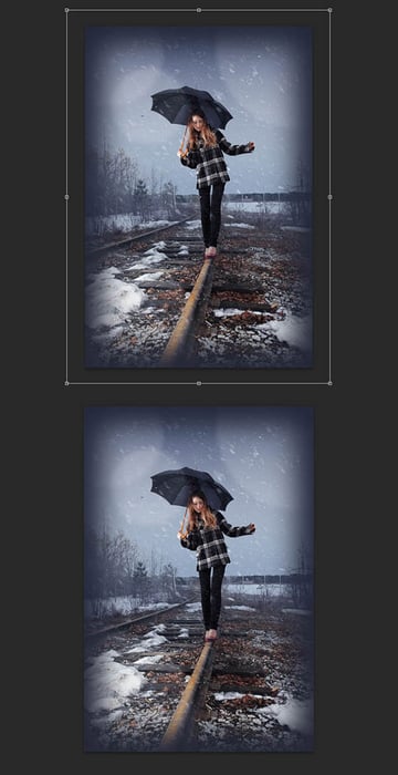 Далее, в зависимости от размеров вашего рабочего изображения, с которым вы работаете, вы можете изменить масштаб слоя со снегом, чтобы снежинки подошли к вашей сцене. В моём случае, я два раза увеличил масштаб слоя со снегом, используя инструмент Свободная Трансформация (Free Transform) (Ctrl + T).
