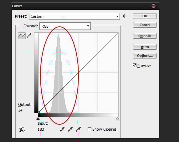 Далее, нажмите клавиши (Ctrl + M), чтобы активировать коррекцию Кривые (Curves). В появившемся окне, вы увидите серую гистограмму по форме напоминающую пирамиду.