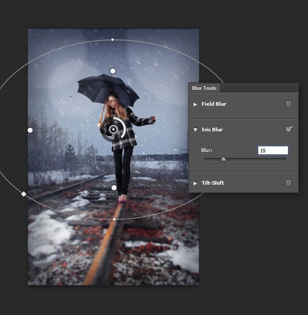 Наше изображение готово, но мы можем добавить отдельные детали, чтобы сделать картину более выразительной. Во-первых, если у вас установлена программа Photoshop версия CS6 или выше, вы можете добавить эффект Размытие диафрагмы (Iris Blur). Для этого, вам вначале необходимо выделить все слои, нажать клавиши (Ctrl + J), чтобы продублировать их, а затем идём Слой- Объединить видимые (Layer > Merge Layers), чтобы объединить дубликаты слоёв в один слой. Далее, идём Фильтр – Размытие – Размытие Диафрагмы (Filter > Blur > Iris Blur) и играем с настройками, чтобы получить красивый эффект размытия.