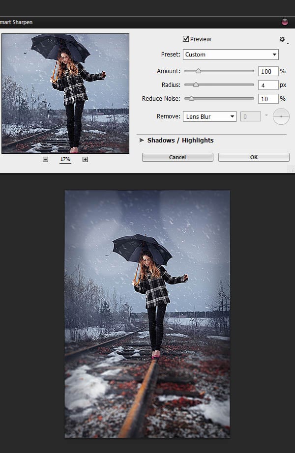 Находясь на том же самом слое, мы можем применить фильтр Резкость (Sharpen), для этого идём Фильтр – резкость – Умная резкость (Filter > Sharpen > Smart Sharpen). Т.к. я работаю с большими размерами изображения, то я использовал радиус 4px, но вы должны уменьшить значение радиуса, если вы работаете с изображением небольших размеров. Основная идея здесь - это утончённость.