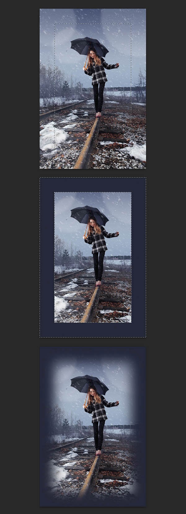 В этом шаге мы добавим эффект виньетки, чтобы немного выделить нашу главную героиню. Вначале создайте новый слой. Выберите инструмент Прямоугольная область (Rectangular Marquee Tool (M), создайте прямоугольное выделение в центре изображения. Далее, нажмите клавиши (Ctrl + Shift + I), чтобы инвертировать активное выделение, а затем идём Редактирование - Выполнить заливку (Edit > Fill) и заливаем активное выделение тёмно-синим оттенком (#222838). Далее, примените большой радиус Размытие по Гауссу (Gaussian Blur), а также поиграйте с масштабом слоя, пока вас не устроит результат.