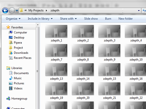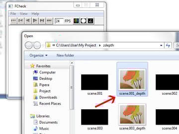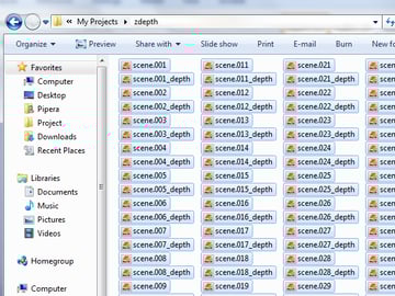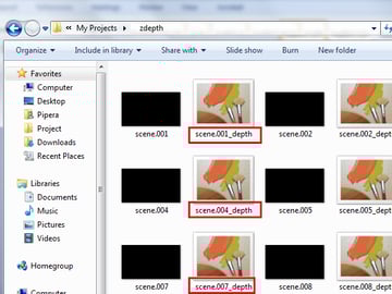 Open the zdepth folder and you’ll see two types of files. One is a TIFF format with no information in it, and the second one is TIFF format too, but with the zdepth information contained in it. You can easily see which one is the depth one because there is ‘_depth’ written at the end of every frame. You need the ones with the depth information.