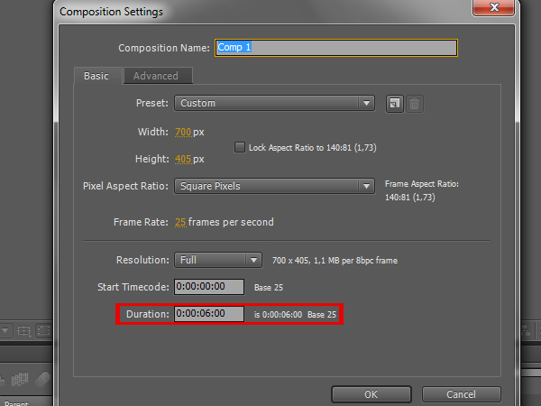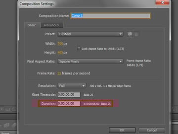 Now you need to set the duration of the composition. To do this, simply divide the total number of frames by the number of frames per second that your frame rate is set to. In this case you have 150 frames, and a frame rate of 25 frames per second, so 150 divided by 25 equals 6 seconds long.