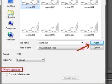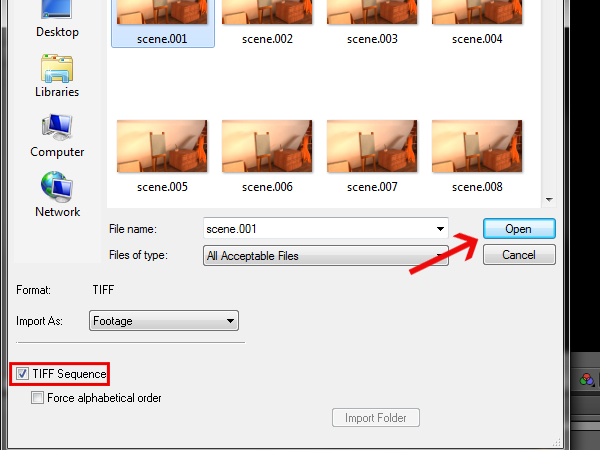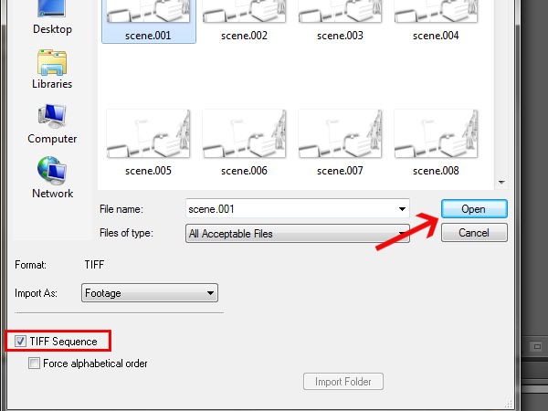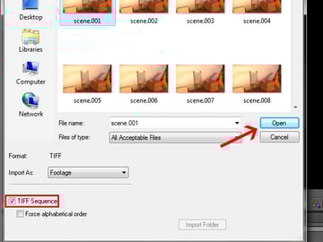 Check the ‘TIFF Sequence’ checkbox, so that it’ll load all of the frames in the folder at once, and then click ‘Open’.