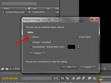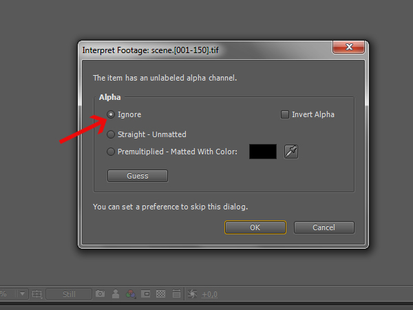 In the window that pops up, select the first option ‘Ignore’, because you don’t have an embedded alpha channel in your sequence.