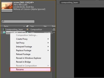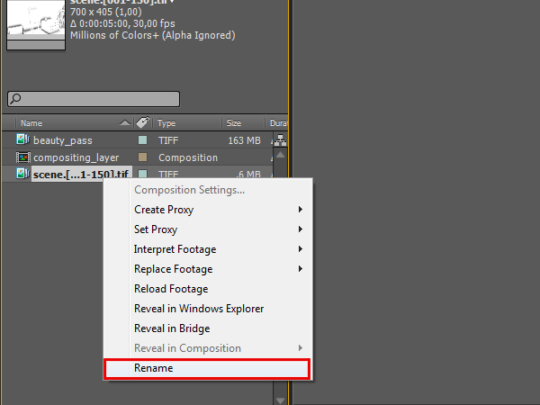 Now right click onto the newly imported sequence, click ‘Rename’, and then rename the sequence to ‘beauty_pass’.