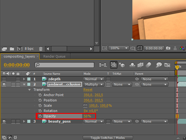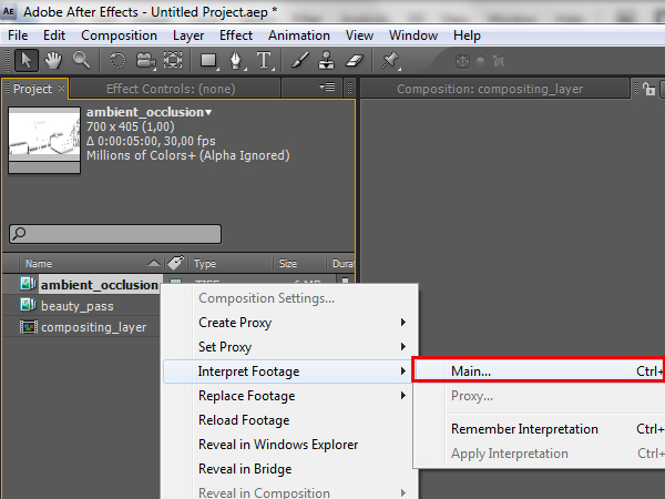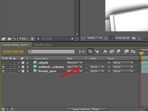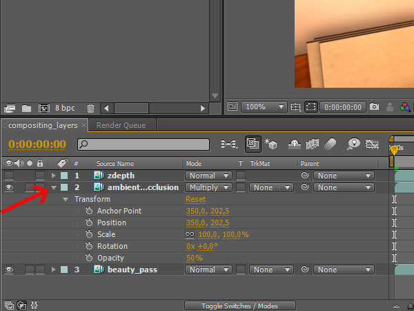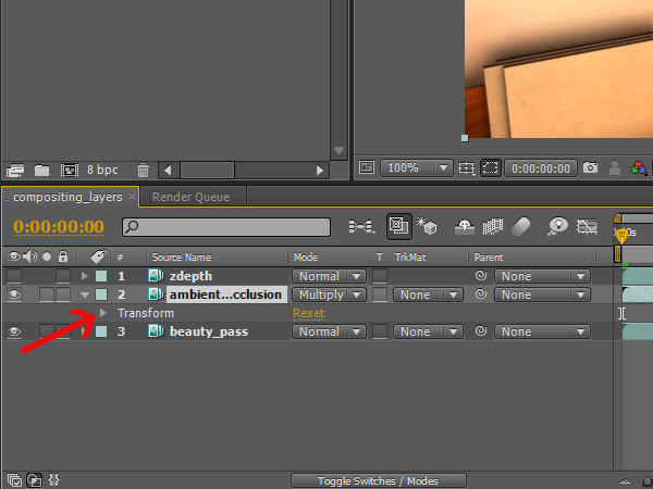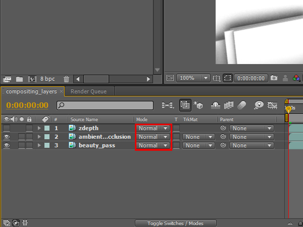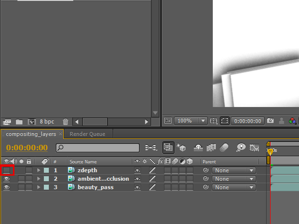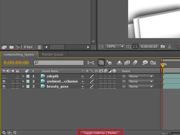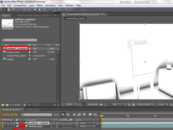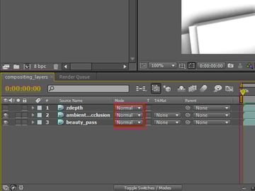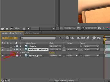 Then click, hold, and drag the ‘ambient_occlusion’ sequence to the layer panel, but make sure that it sits on top of the ‘beauty_pass’ layer.