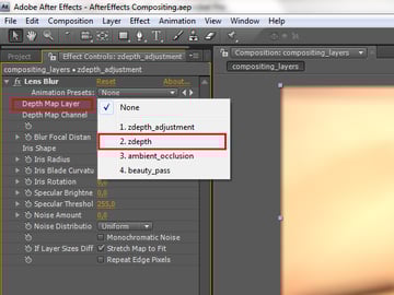 Now you need to select from which layer the depth information should be coming. Naturally, we want it to be coming from the ‘zdepth’ layer, so left click on the ‘Depth Map Layer’ attribute, and select the ‘zdepth’ layer.