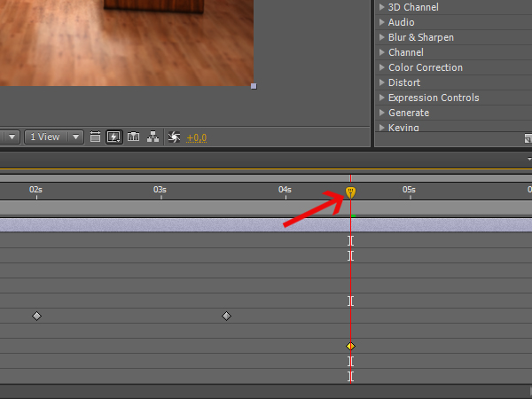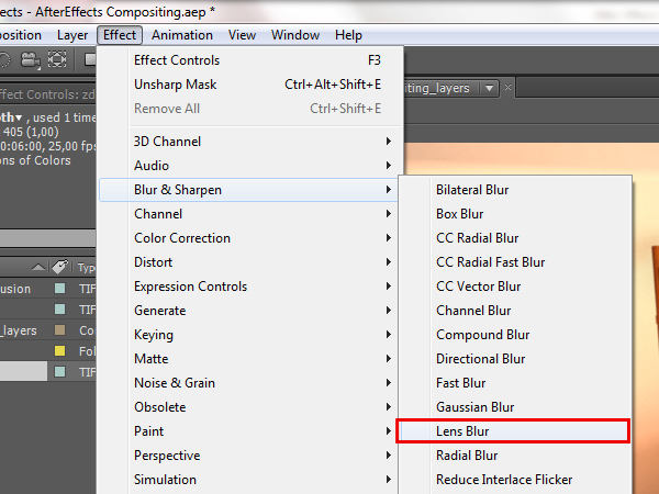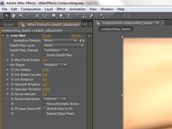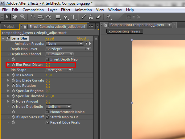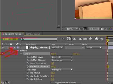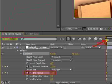 When the first frame is ready, you can start animating the depth of field effect. First you will need to expand the ‘zdepth_adjustment’ layer, so you can see the effect attributes in the time line. Click on the arrow of the zdepth adjustment layer, then click the next arrow that shows up next to ‘Effects’, and then expand the ‘Lens Blur’ effect if it isn’t already expanded.