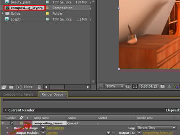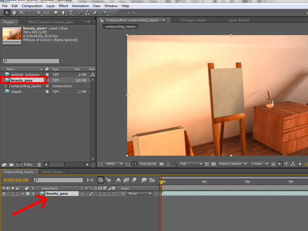 Click and hold on the ‘beauty_pass’ sequence, and drag it to the layers panel to import it in the ‘compositing_layers’ composition.