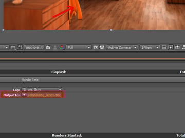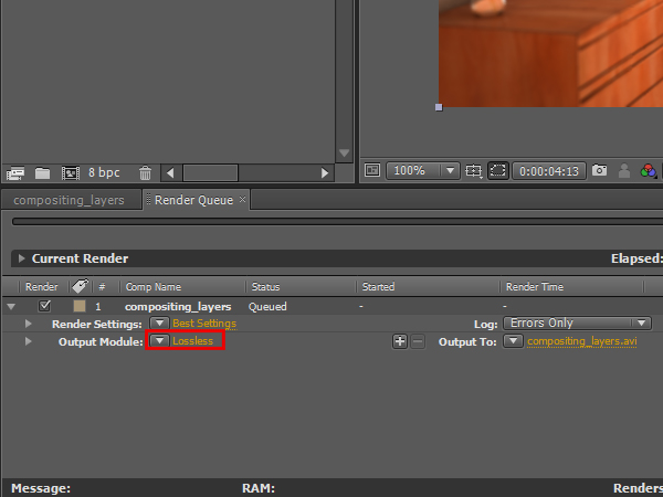 Click, hold, and drag the ‘compositing_layer’ composition into the ‘Render Queue’. You should see the output settings for the composition.