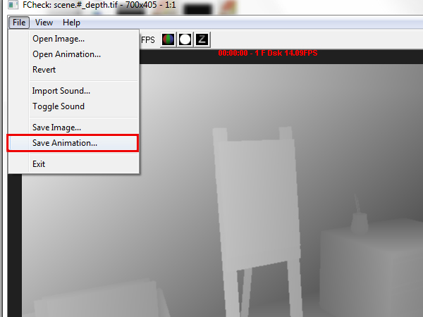 To export your zdepth animation to a TIFF that After Effects can read, go to ‘File -> Save Animation’.