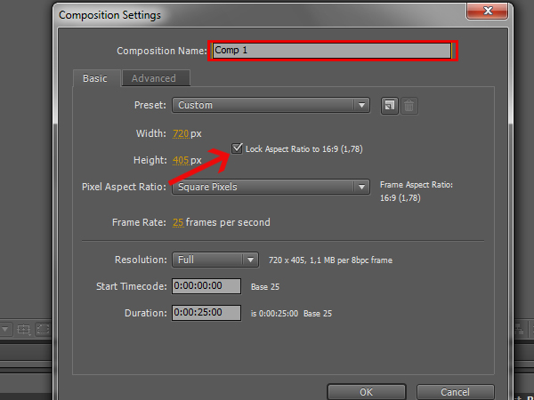 In the window that pops up, change the ‘Composition Name’ to 'compositing_layers'. Then make the resolution of the composition the same as that of the rendered layers. To do this, un-check the ‘Lock Aspect Ratio’ checkbox.