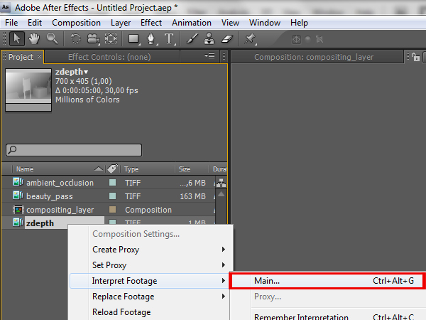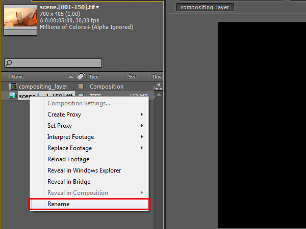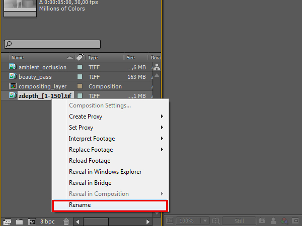 Right click on the imported sequence, click ‘Rename’, and rename it to ‘zdepth’.