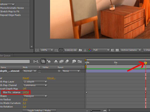 Drag the time slider to 2 seconds, and set the ‘Blur Focus Distance’ to 147. This will create a new key at 2 seconds, and will bring the drawer with the glass object into focus.