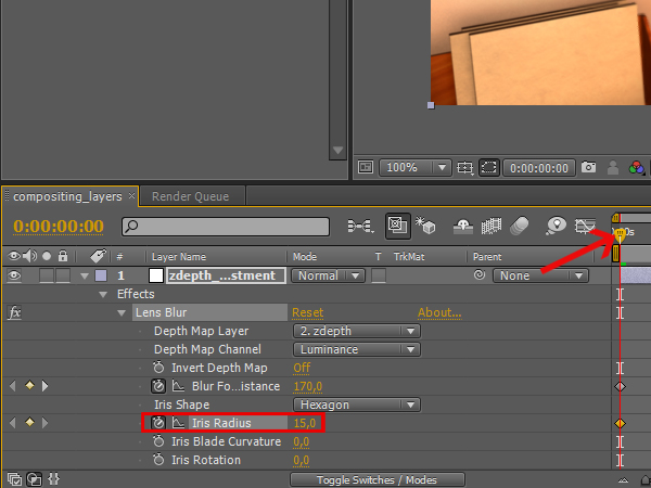 Go to the first frame again, but this time click the stopwatch for the ‘Iris Radius’ attribute. This will determine how blurred the depth of field will be. The initial radius of 15 is fine for this frame.