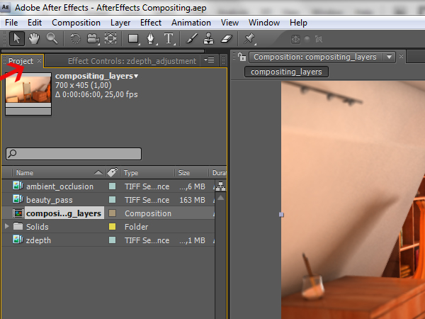 You are now ready to render the composition with all of the layers combined! First switch to the ‘Project’ tab, so you can see your ‘compositing_layers’ composition.