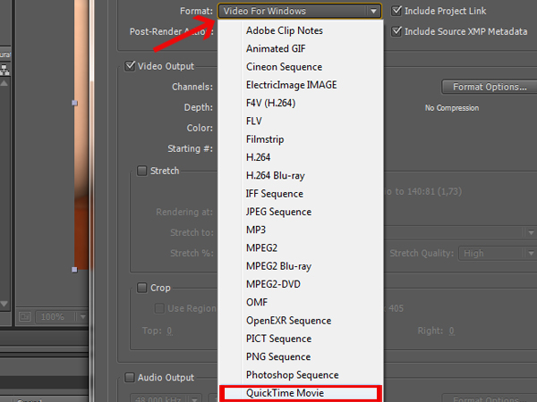 Click on the ‘Format’ options menu and select ‘Quick Time Movie’. You can use any format or compression settings that you want.
