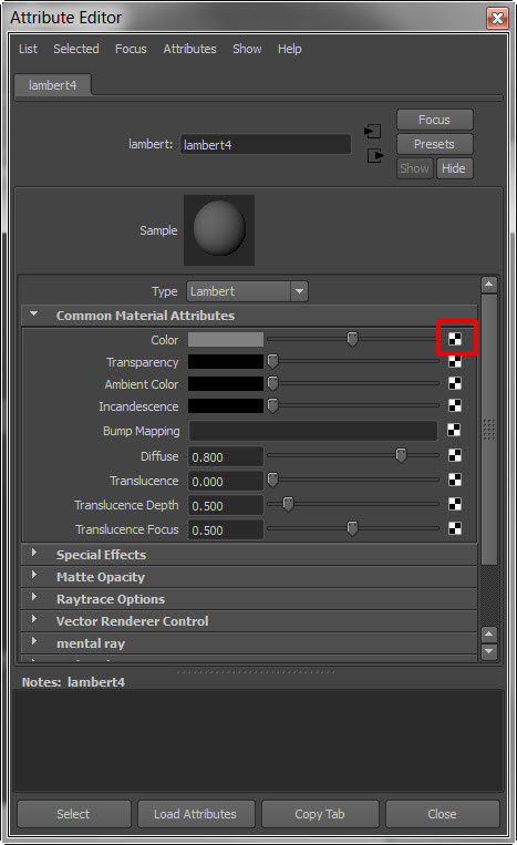Now "Double Click" on the "Lambert" Material you just created, and then Click on the Channel Button next to the color input.