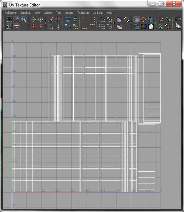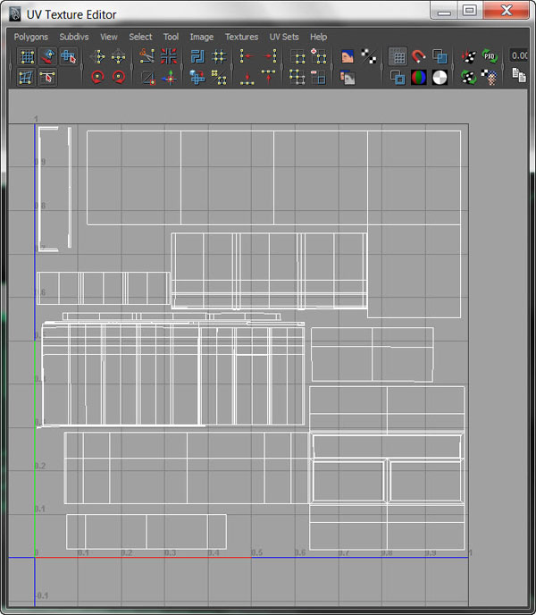 Now before we start anything make sure you have a proper UV Layout for your model, and the file you are working with is saved and has a project set properly for it. The image below shows the Uvlayout for the model I'll be using.