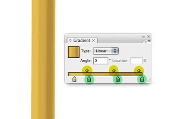 The barrel of the pencil can be quickly created using a gradient to the fullest extent. To give the impression of a number of faces on the pencil apply a gradient with four colors, all slightly different but in the same family. Next, slide the yellow highlighted areas below so they're as close to the green highlighted areas.