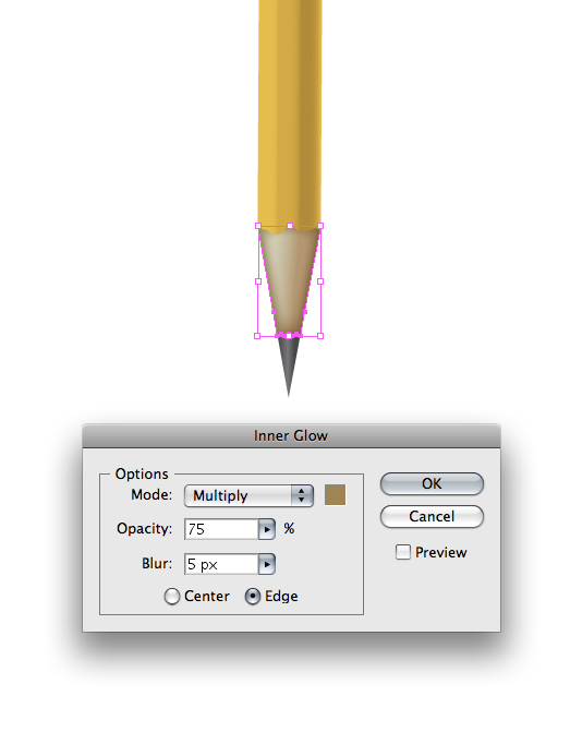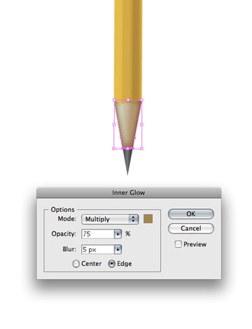 Give the tip of the pencil gradients. Give the exposed wood section of the pencil an Inner Glow by going to Effect > Stylize > Inner Glow...