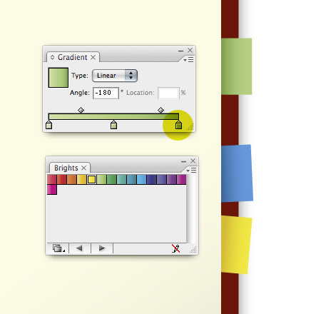 Create some colorful tabs by drawing a rectangle and then using the preset gradients to color them in. To access them go to Window > Swatch Libraries > Gradients > Brights. You may want to make the highlighted color slightly darker as our design calls for the tab to appear as if it's wedged in between the pages.