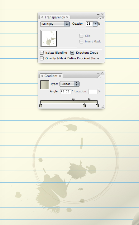 Give your stains some gradients, set their Transparency to Multiply and adjust their Opacity to help them blend with the paper.