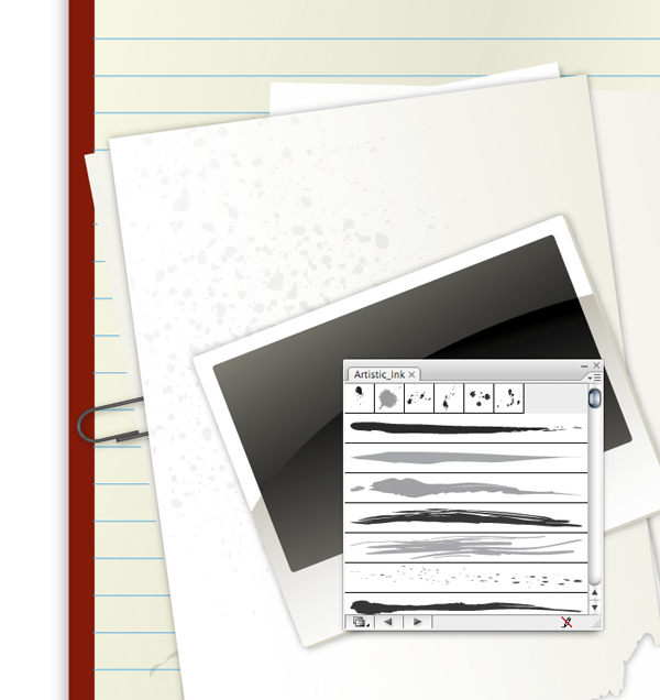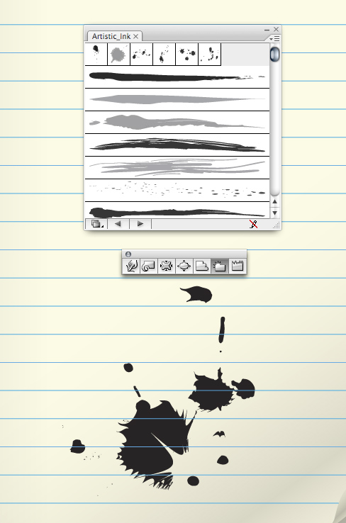 Easily make random stains on the paper by using the Artistic Ink panel. Go to Brush Libraries > Artistic > Artistic Ink. You can drag the swatches right onto the page or you can draw a line using the Pen Tool and apply the swatch to the line. To further edit the ink swatches you'll need to expand the ink first.