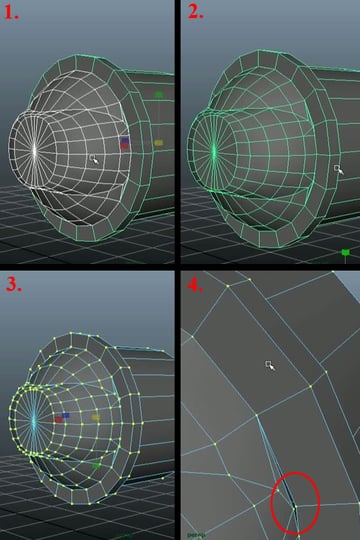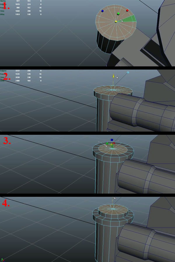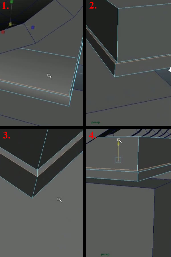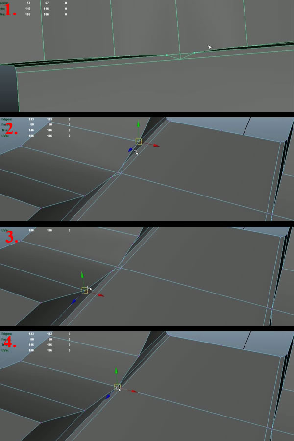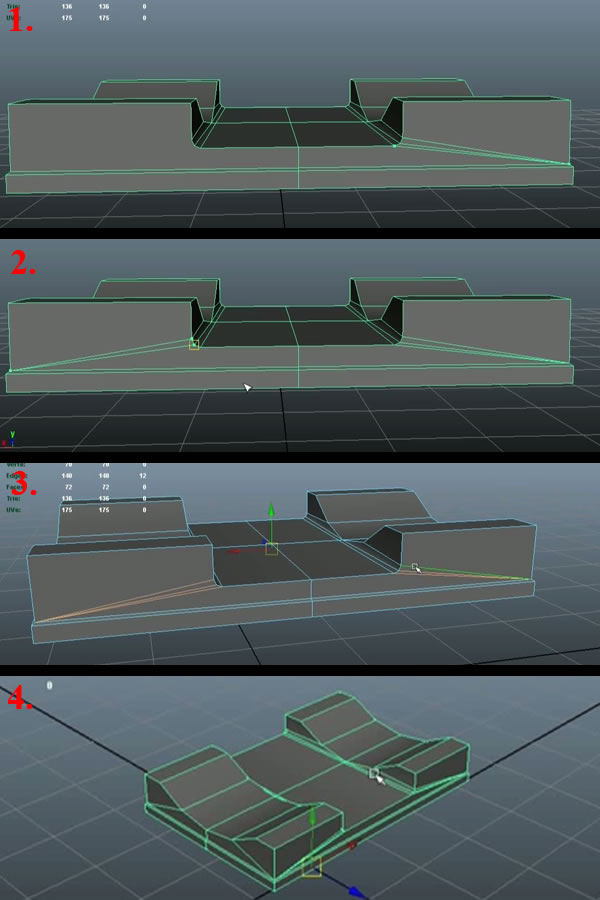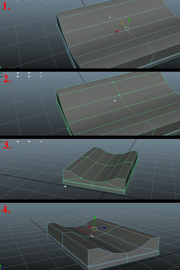 Now connect the open vertices using the "Split Polygon Tool" on both sides (1-2). Then select all the newly created edges and "Soften" them (3). Finally select the centre edge loop and delete it (4), as it was not supporting any form of the base.