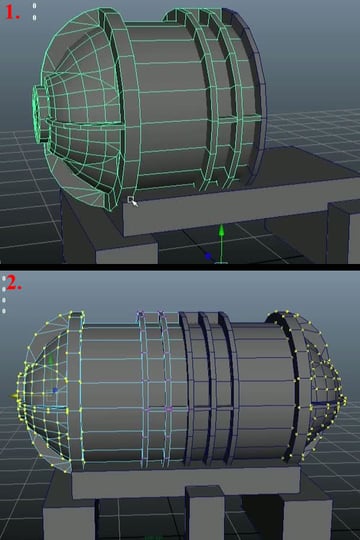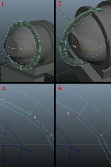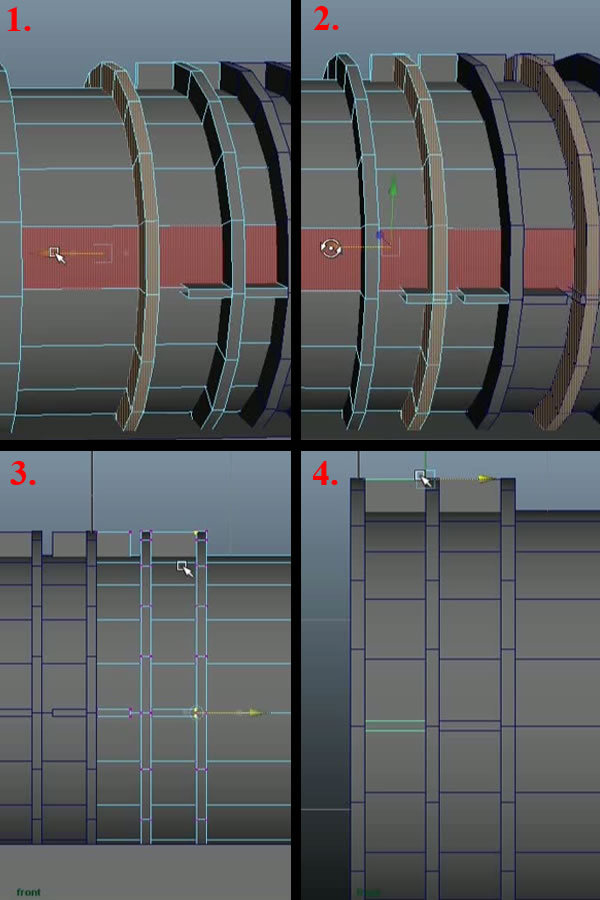 Now duplicate the same mesh once more and rotate it 180 degrees in the "Y-axis" (1-2). One thing which is noticeable is that one side of the mesh is broader than the other side, so go to the "Side View", and using the "Insert Edge Loop Tool" create an edge loop on the broader side, just about the same position of the less broad one (3). Then in "Edge Selection" mode select the lower edge ring (4) and convert it to face by pressing "Ctrl+f11", and then delete that selection to make both sides even.
