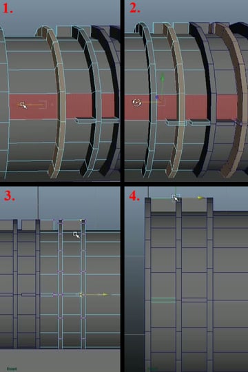 Now go to the "Front View" and select the center vertices of the slabs (1) and move them inside so they fit into the gap (2). Then select them in "Face selection" mode (3) and duplicate them (as we did in the 1st step) and move them inside the next gap (4).