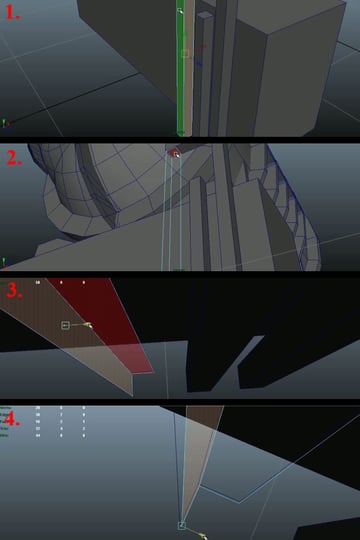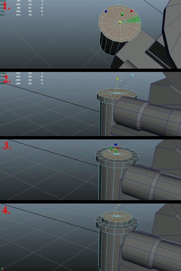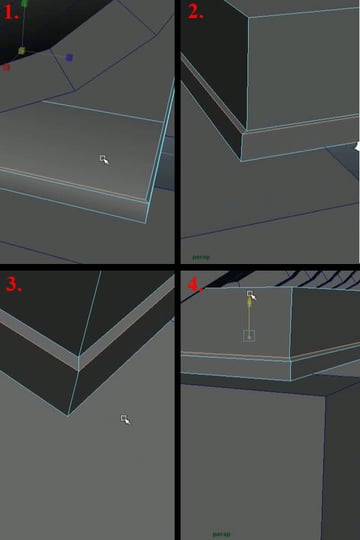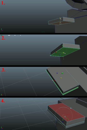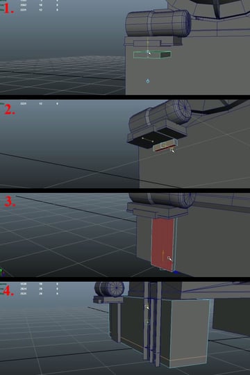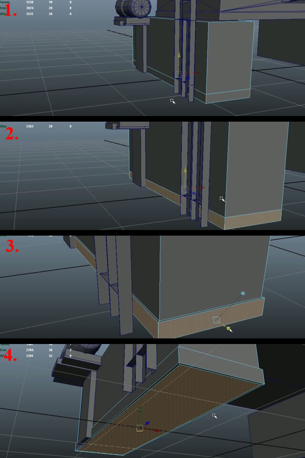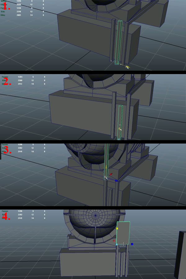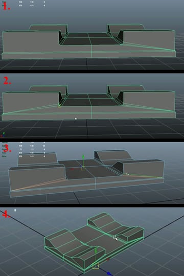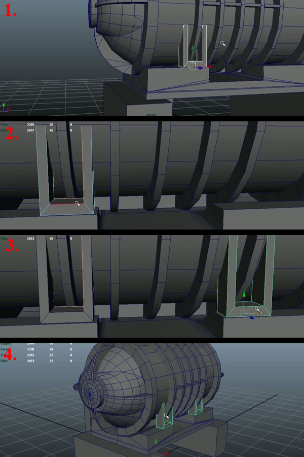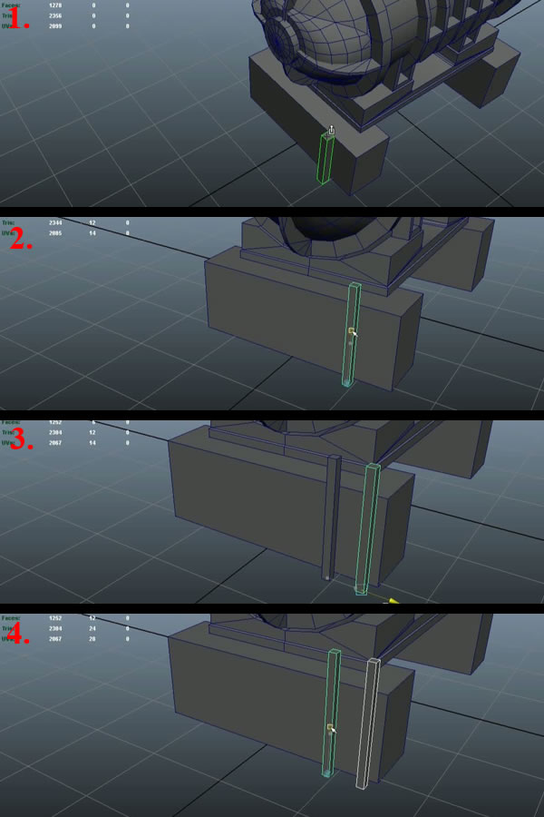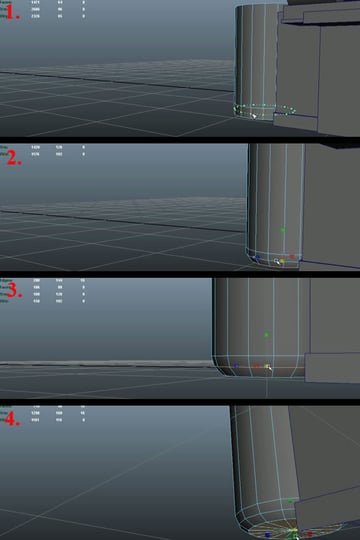 Duplicate the same base and tweak the shape to have a base stand (1-3), then add an edge loop near the bottom of one of the main legs using the "Insert Edge Loop Tool" (4).