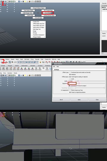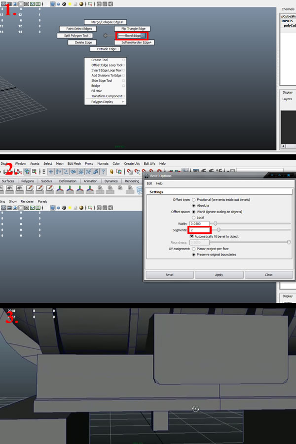 Now press "Shift+Right Click", hold and move over to the "Bevel Edge" options box while still holding down the "Right Mouse Button" (1), and it will open a new options box. Now change the "Segments" to 2 (2). This will add 2 supporting edges around the selected edges and thus provide roundness to the shape (3).