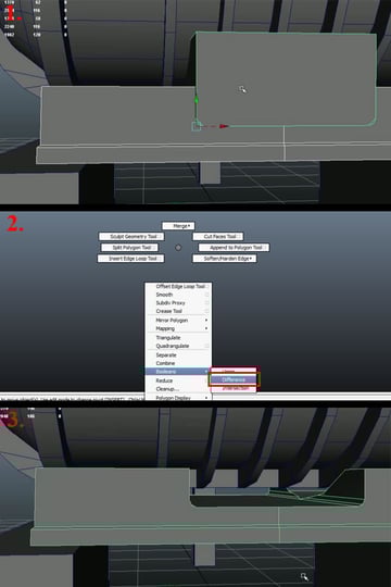 Now select this new mesh and "Reverse Normals" (1), then combine it with the base to make it a single mesh (2). Use the "Append Polygon Tool" (through the "Shift+Right Click" hotbox)(3), and click the open edges which you want to fill to create a solid mesh (4).