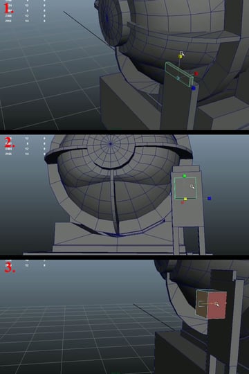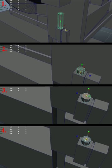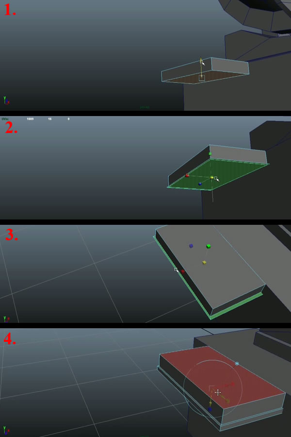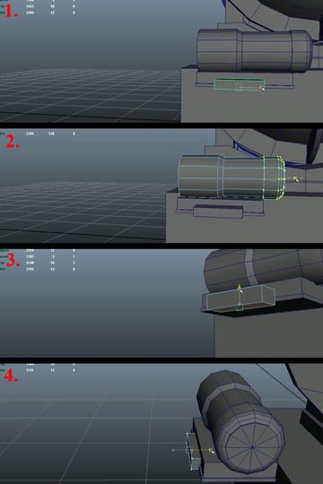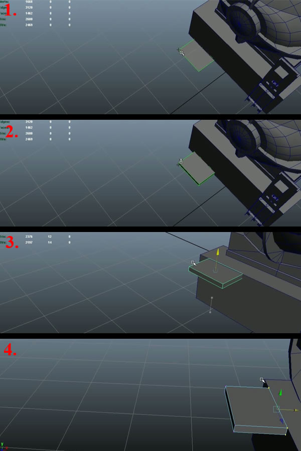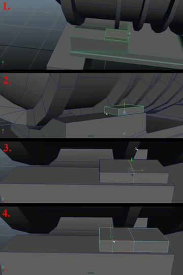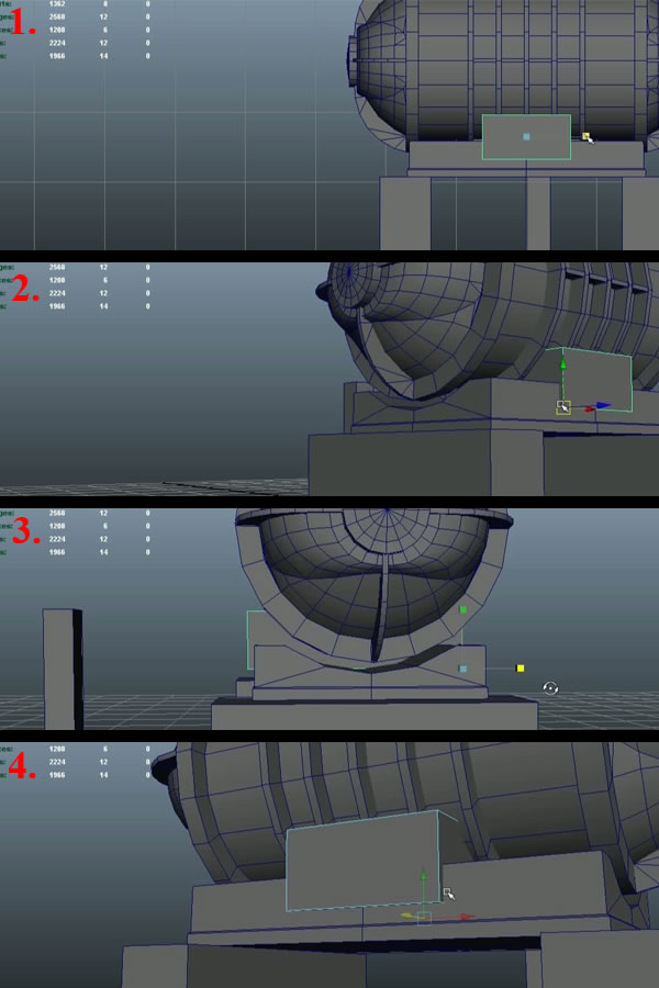 Now create another Cube and decrease the width of the motor (1), and adjust the base support mesh according to the reference image (2-4).