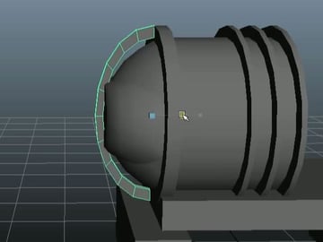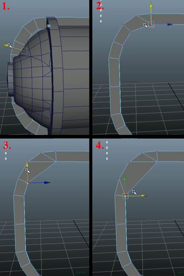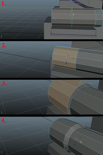 Now split the Cylinder using the "Insert Edge Loop Tool" (1) and select these faces and "Extrude" them (2). Then select the upper edge loop and move it towards the rear a litlle to have a slanted shape (3). Also adjust the smoothing groups side by side (4).