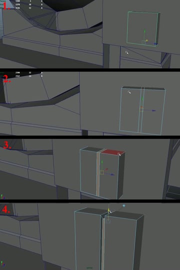Now duplicate the upper cube to create the 2 fuses and position it at the bottom of control panel (1). Insert these 2 edge loops using the "Insert Edge Loop Tool" (2). Now select the faces at the center and extrude them inside a bit (3-4).