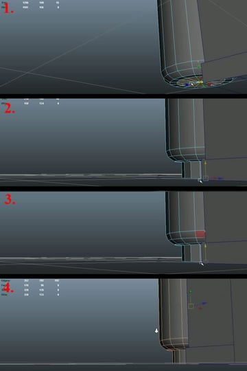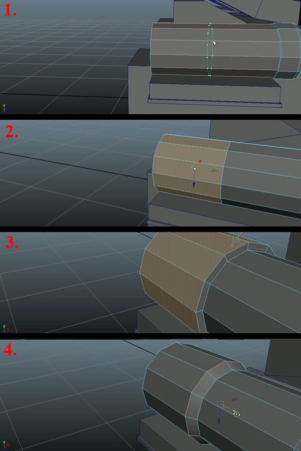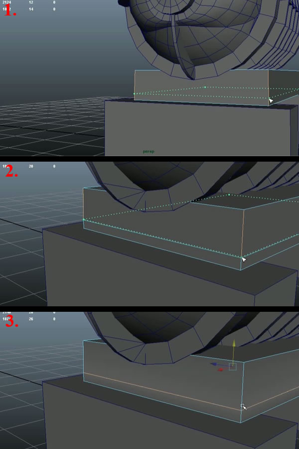 Now using the "Insert Edge Loop" tool, insert a loop near the lower edge (1), and then using the same tool insert another edge loop just a little above it (2). Then select this 2nd edge loop and by pressing "d+v" snap align it with the lower one in the Z-axis only (3).