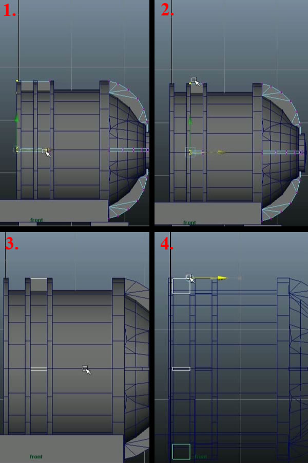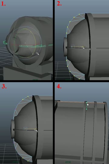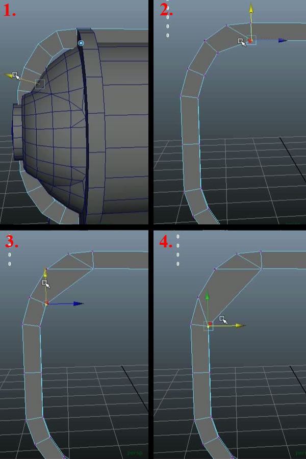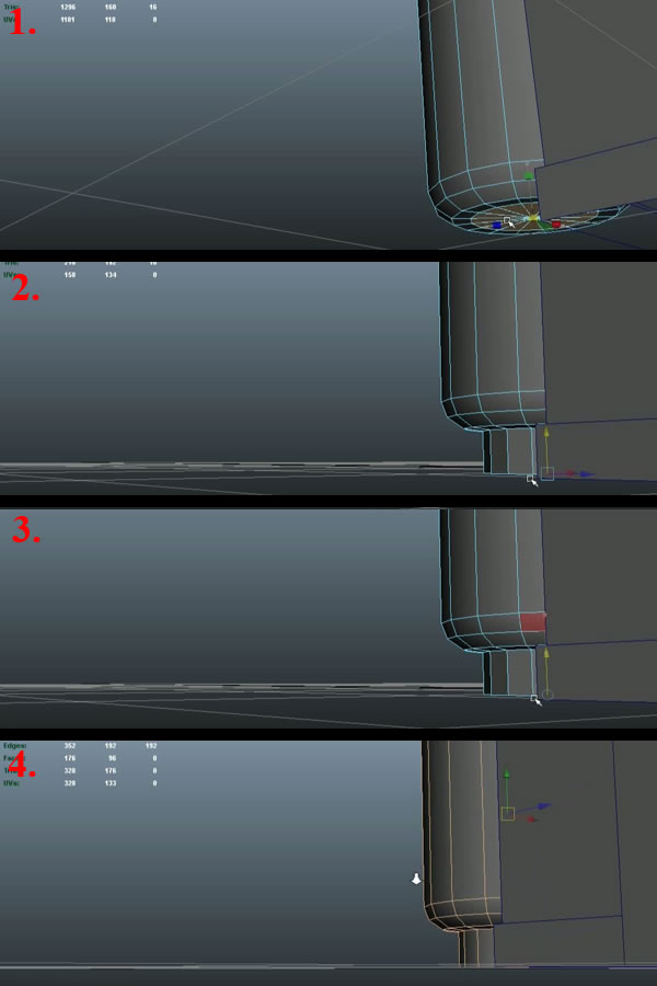 Now using the "Insert Edge Loop Tool", insert 2 edge loops near the bottom (1), and then scale them down to have the nice curve at the bottom (2-4).