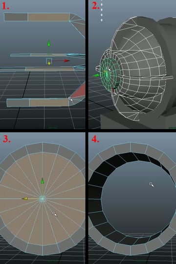 Now select the center faces and delete them (1), then select every mesh except for the base cylinder (2), and hide them using "Ctrl+H". Then select the center faces of the cylinder (3) and also delete them (4).